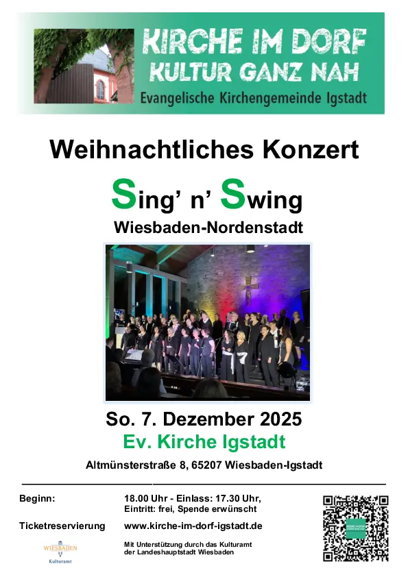 Am 07. Dezember um 18 Uhr gibt der Pop-Jazz-Chor Sing‘n‘Swing aus Nordenstadt ein Weihnachtskonzert in der Igstadter Kirche. Etwa eine Stunde lang werden Weihnachtslieder aus aller Welt präsentiert.
