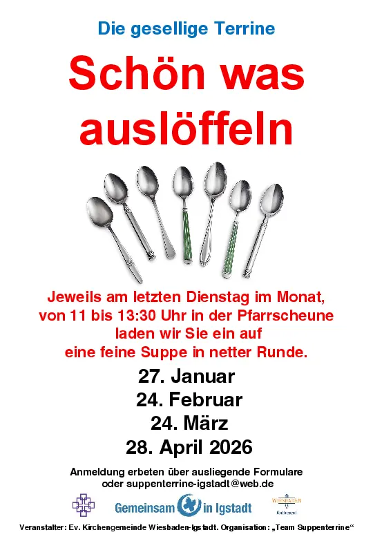 Die Suppe des Tages ist ein gut gehütetes Geheimnis, dennoch ist der monatliche Dienstag kein risikoreiches „blind date“. Die Gäste wissen, dass sie auch 2026 nur Gutes erwartet: nette, vertraute Menschen, eine freundliche und informative Begrüßung, lebhafte Gespräche, Brettspiele, Bücher zum Stöbern, die fröhliche Skatrunde der Männer, die leckeren Suppen aus den noch dampfenden Töpfen, Landbrot und das abschließende Kaffee&Keks-Gedeck. Das sind allerbeste Zutaten für eine gesellige Mittagszeit, zu der das Terrinen-Team der Ev. Kirchengemeinde gemeinsam mit Engagierten aus Igstadt herzlich einlädt.