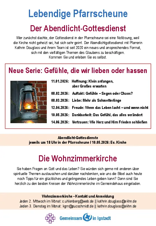 Ein Gottesdienst besonderer Art findet einmal monatlich nicht in der Kirche sondern in der Pfarrscheune statt: der Abendlicht-Gottesdienst. Er folgt nicht dem traditionellen Ritus, sondern nimmt ein zentrales Thema des Glaubens in die engere Betrachtung, dargeboten in einem spannenden oftmals dialogischen Vortrag. Zu diesem können dann Fragen gestellt werden, auf Zetteln anonym vorbereitet, zu denen die Vortragenden Stellung nehmen. Die Fürbitten werden auch von der Zuhörerschaft formuliert, indem sie ihre Anliegen privater, gesellschaftlicher oder politischer Art einbringen. Eingeleitet und umrahmt von viel moderner christlicher Musik einer Band schließt die Feier und geht zum gesellschaftlichen Teil des Abends bei Wein und kleinen Leckereien über. Dabei bleibt Zeit zum Kennenlernen und ggf. für vertiefende Gespräche.