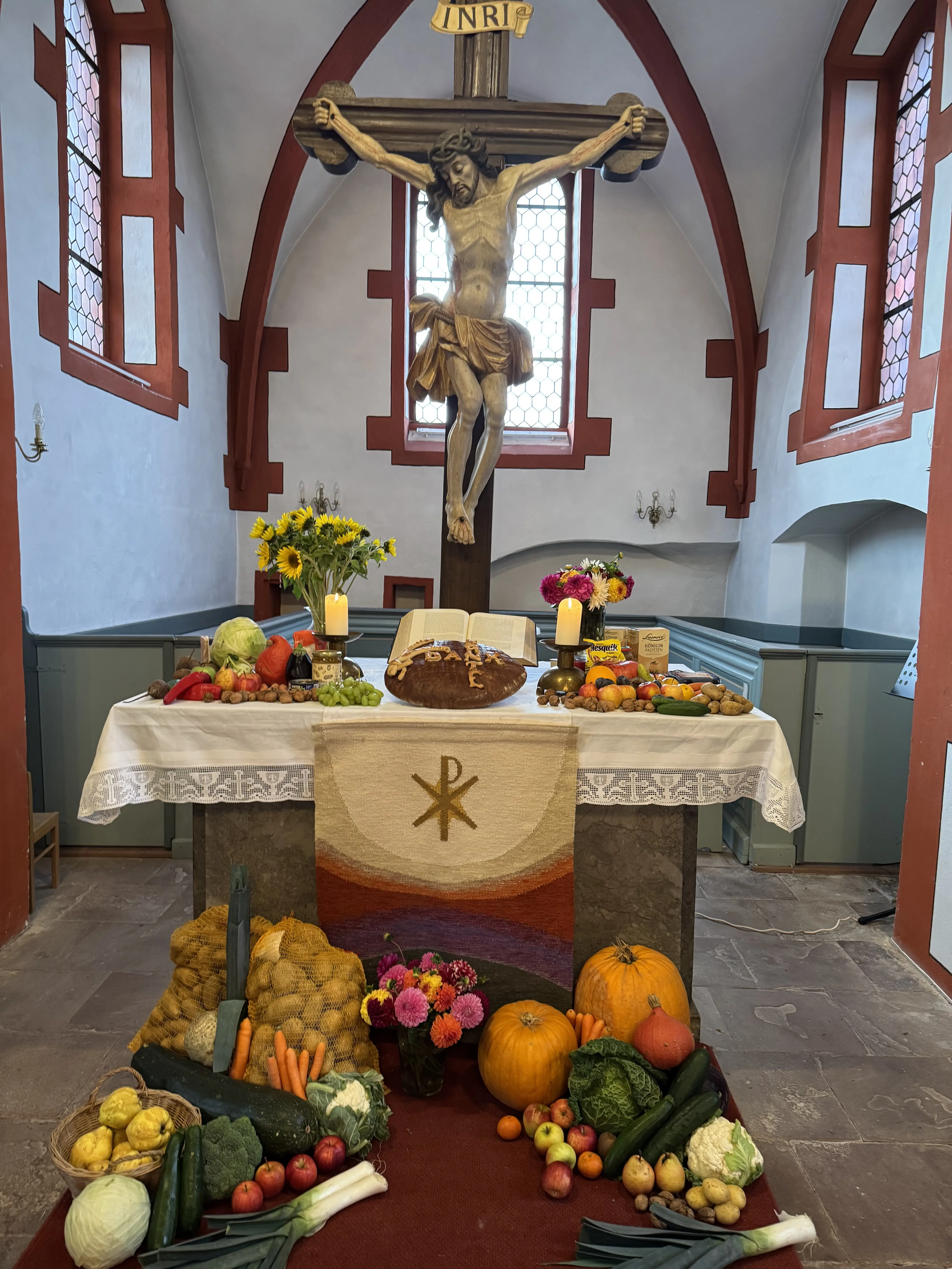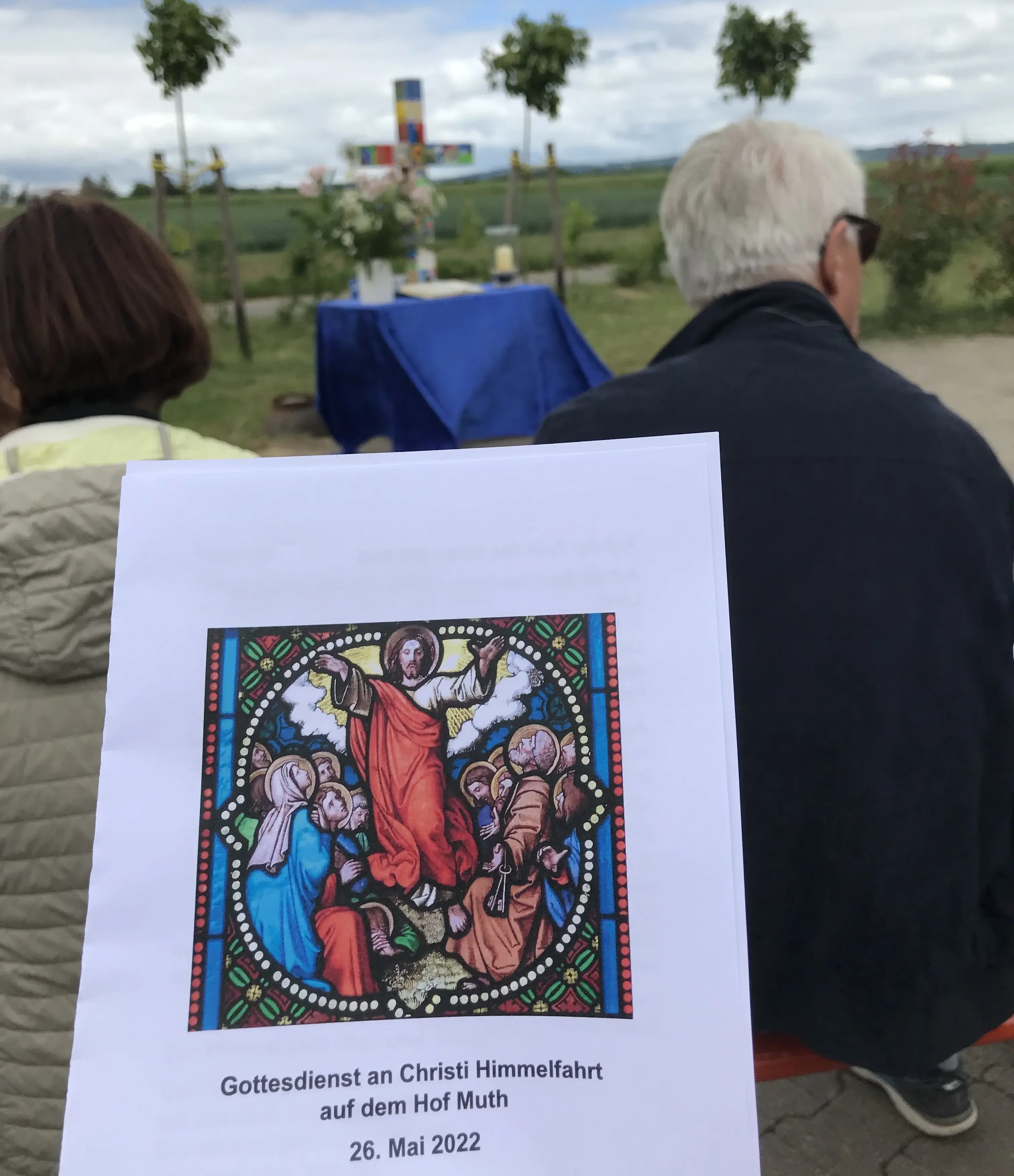 Mit ca. 70 Teilnehmerinnen und Teilnehmern aus den Kirchengemeinden Kloppenheim/Hessloch, Igstadt und Bierstadt war der Pilgergottesdienst an Christi Himmelfahrt ein großer Erfolg. Das Hofgut Muth vor den Toren Bierstadts lud zum Verweilen an. Der schöne Hofladen, bespickt mit vielen nachhaltig hergestellten Produkten, konnte besichtigt werden. Der Gottesdienst im Freien wurde von Frau Pfarrerin Eva-Maria Spinola und Herrn Pfarrer Philip Messner gestaltet, musikalisch umrahmt von Kantor Thomas Schwarz und seiner Gesangsgruppe 3für1. Für die gute Verköstigung sorgten Adelheid Ewen und Petra Schmidt mit Unterstützung des Hofgutes Muth.