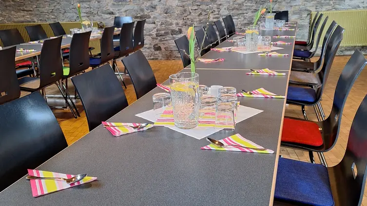 Unser Gemeindezentrum Pfarrscheune besteht aus dem Gemeindehaus und der Pfarrscheune mit Foyer.